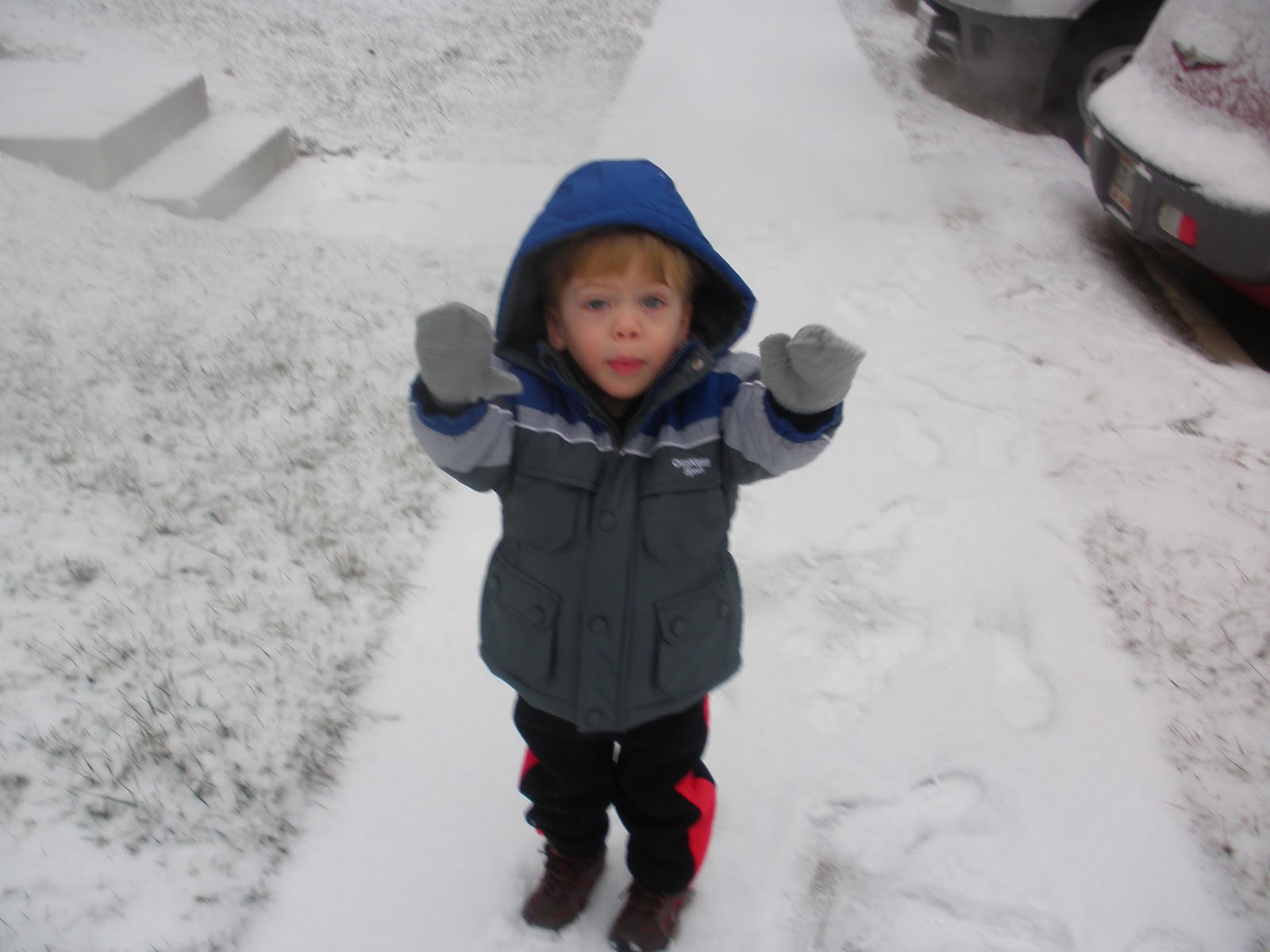 Woodbridge - On Saturday morning we woke up to a ground covering of snow. Before we left for our weekly shopping, Ryan went outside to check it out. Eventhough he had his boots, gloves and coat on, he was not happy. He did not like to touch it, walk in it or just be out there. The whole experience was maybe 3 minutes. Maybe next time he will like it better.